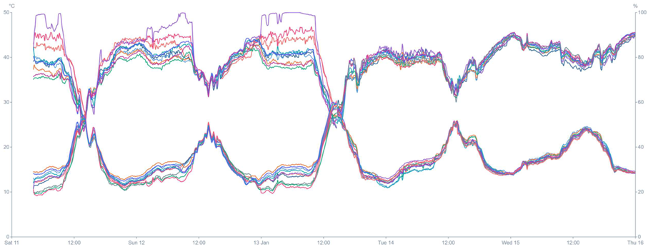 Pim van Adrichem of HortiTech says that ‘the system does what it promises’ and that they are impressed with the results at HortiTech. The use of Caeli™ has already shown that the temperature in the test greenhouse is much more stable and the humidity also varies less. The graphs before and after using Caeli™ show that the temperature and humidity lines are much closer together than without Caeli™, as can be seen below.